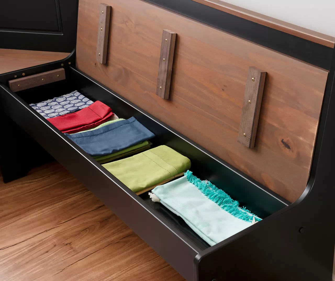 - Both corner benches lift up to reveal hidden storage compartments