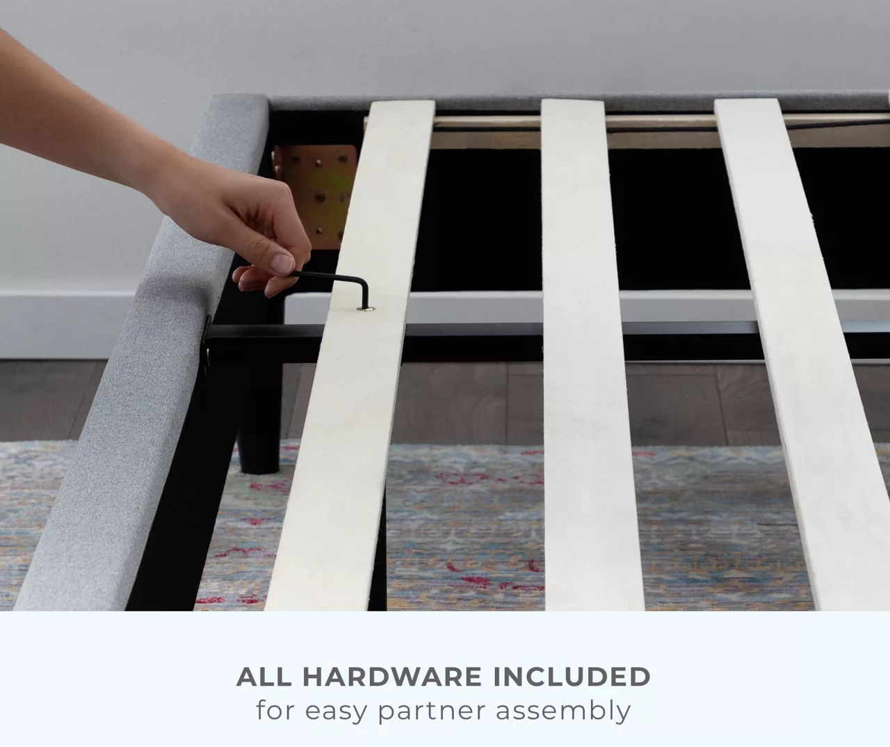 - Includes bed frame, headboard, side and foot rails, legs, 14-piece slat roll and all hardware needed for assembly