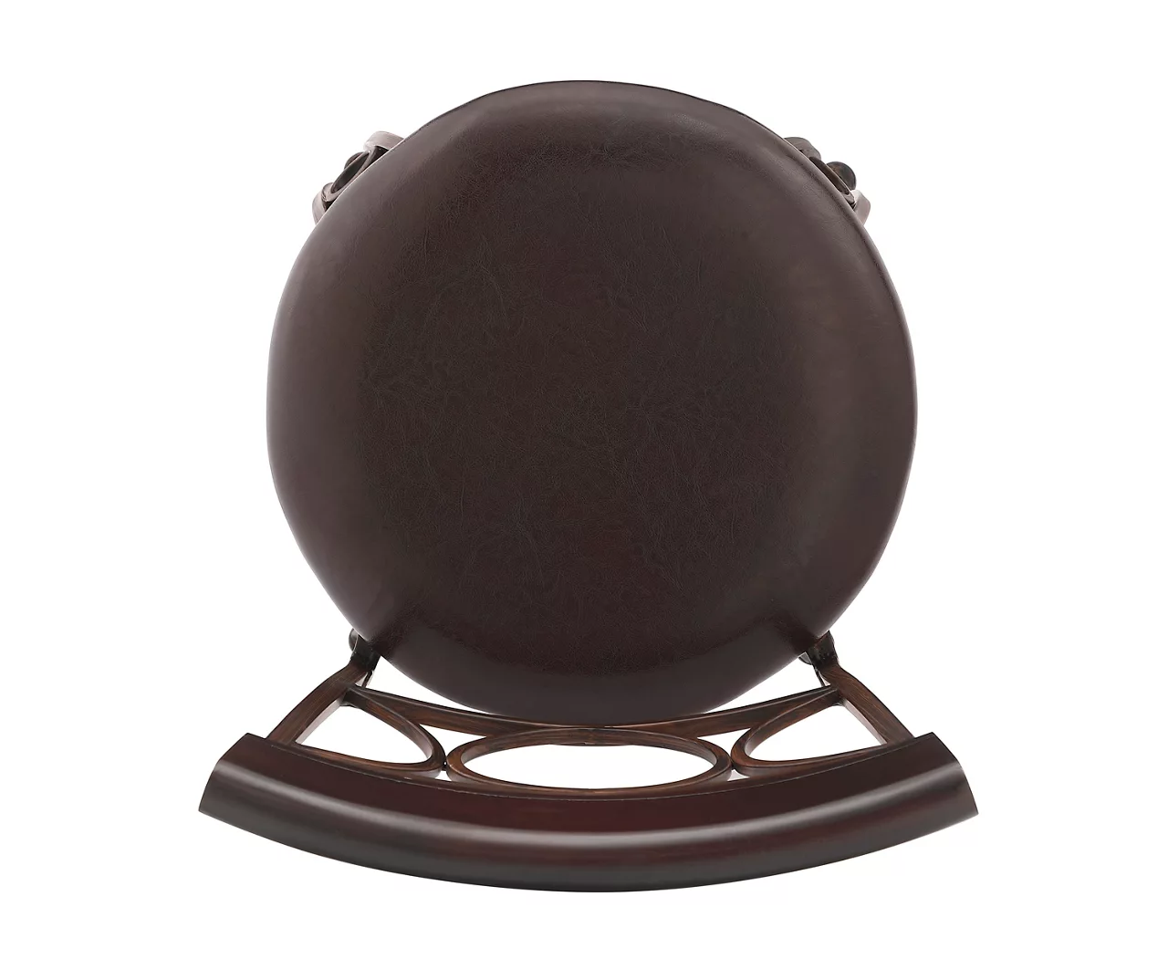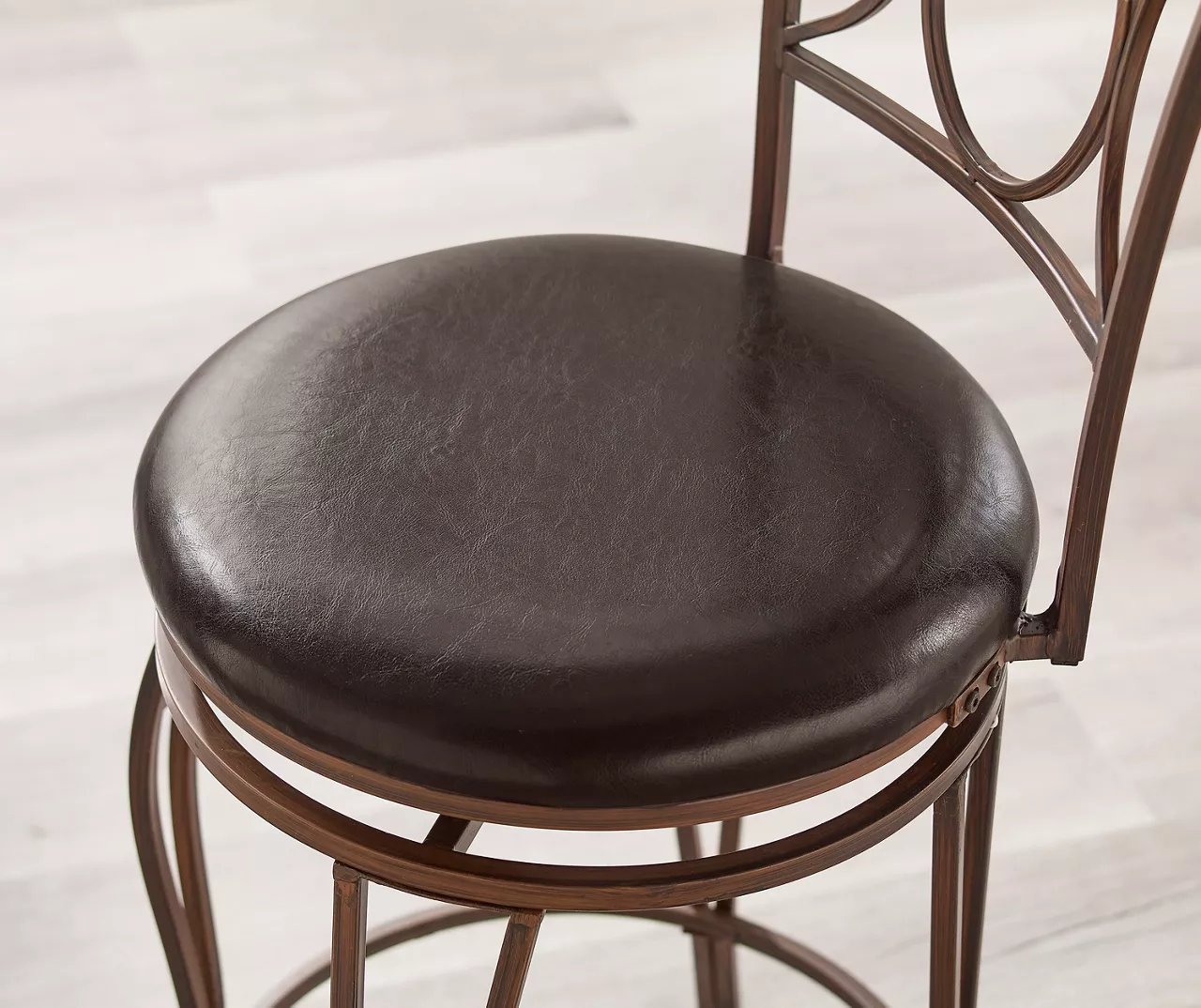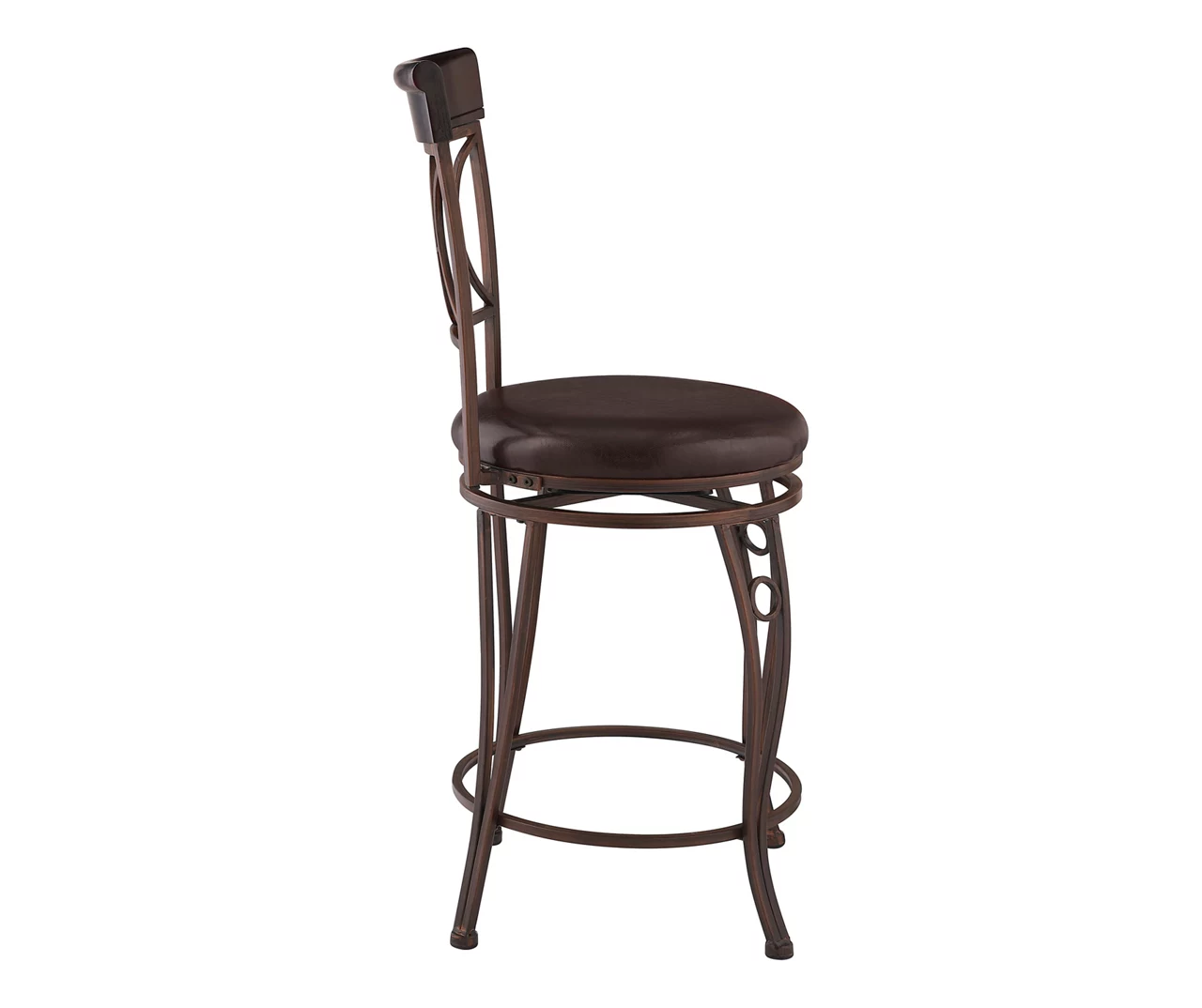 Sleek circles contrast with the sharp lines of this counter stool giving it a contemporary look that enhances any home. Sturdy yet sophisticated, this stool features a metal frame fitted with foot rests for a comfortable yet stable feel. Cushioned faux leather upholstery mimics the supple look and feel of real leather combined with long-lasting durability and easy care.