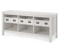 - Powder-coated metal frame TV stand with white finish